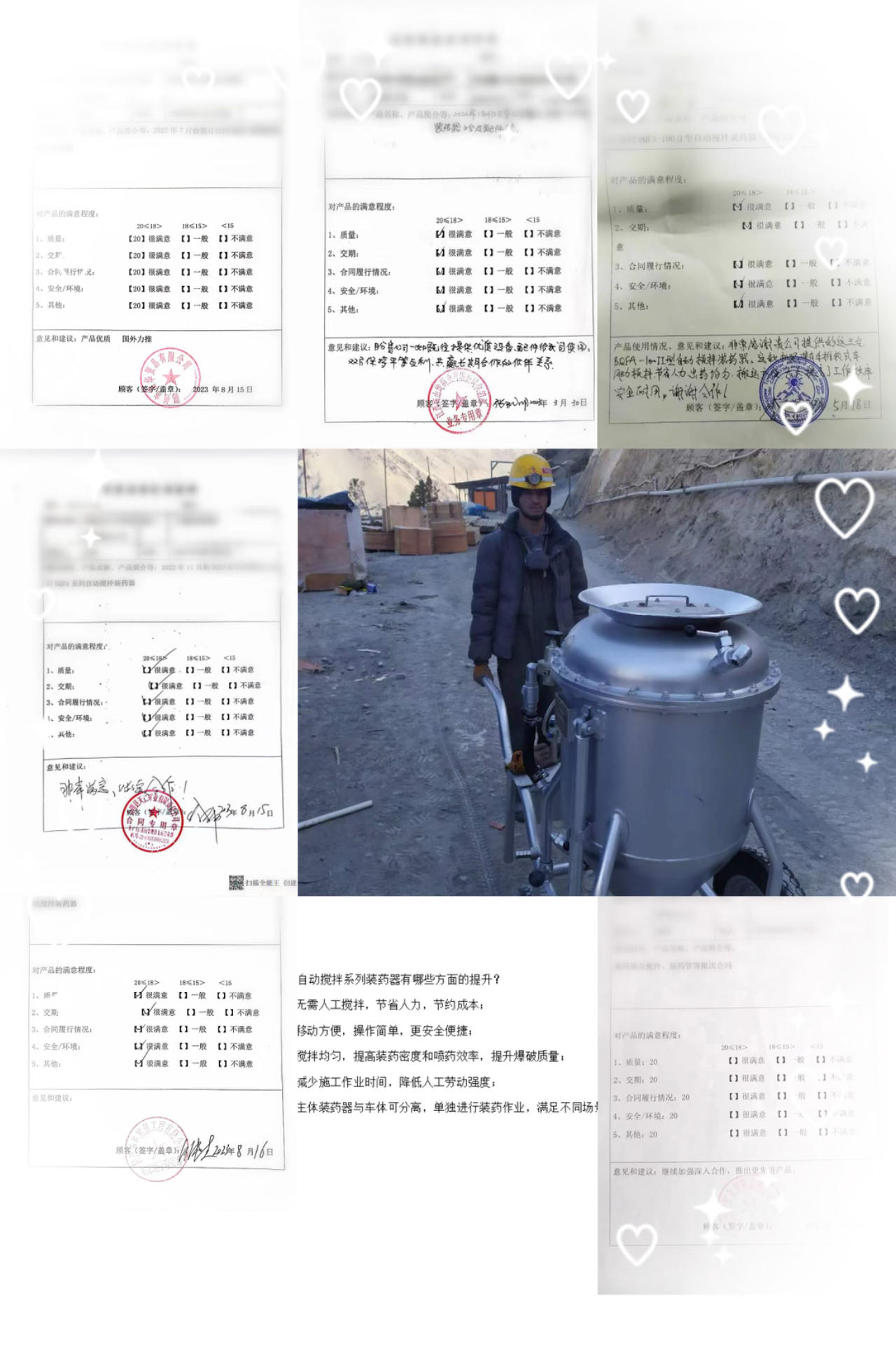 BQFA型自動(dòng)攪拌系列裝藥器,與人工攪拌相比,無需人工攪拌,節(jié)省人力且攪拌均勻,移動(dòng)方便,操作簡(jiǎn)單便捷,大大降低人工勞動(dòng)強(qiáng)度,提高裝藥密度、爆破質(zhì)量,減少施工作業(yè)時(shí)間。先后出口塔吉克斯坦、老撾,秘魯,尼日利亞、法國等國家,使用情況反饋中得到一致好評(píng)并大力推薦。